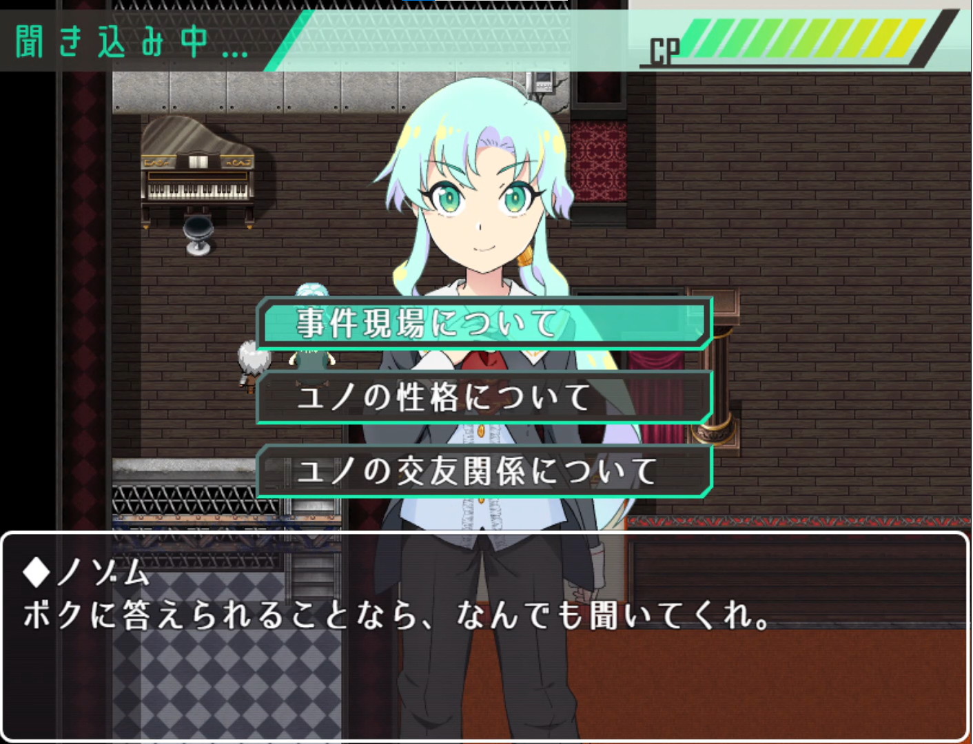 • 2Dマップ内を探索し、事件関係者から話を聞くことが出来る。