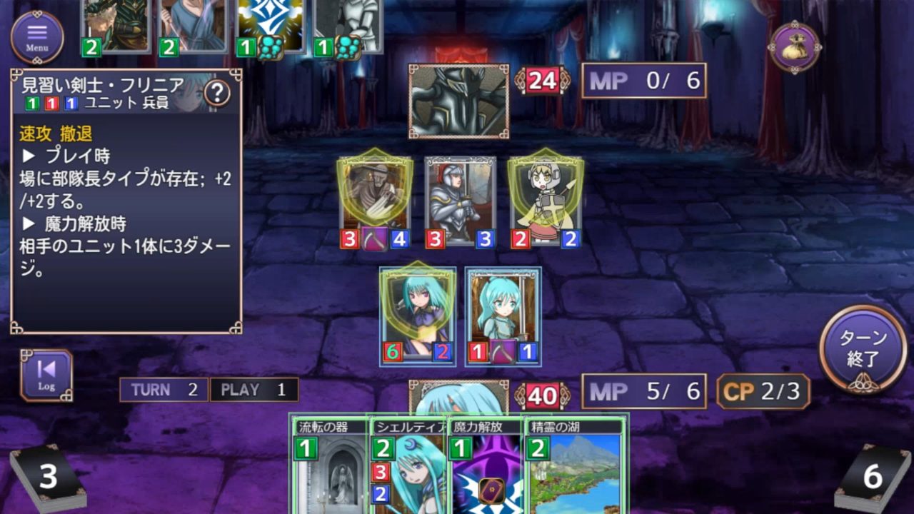 最後に画面下の説明に移るが、これはプレーヤーの手札を表している。全てのカードは左上に緑色で数字が表現されており、これはカードの持つコストを意味する。プレイヤーの傍にMPという表示があるのが分かるだろうが、このMPを消費しながらカードを取捨選択していくことになる。そのターンでMPが尽きやることが無くなればターン終了を選択する。本作はこうしてお互いのターンを行き交いカードを引いていき、MPと相談しつつ各3種類のカードを上手く使い分けて盤面に配置しながら戦っていくゲームフローである。