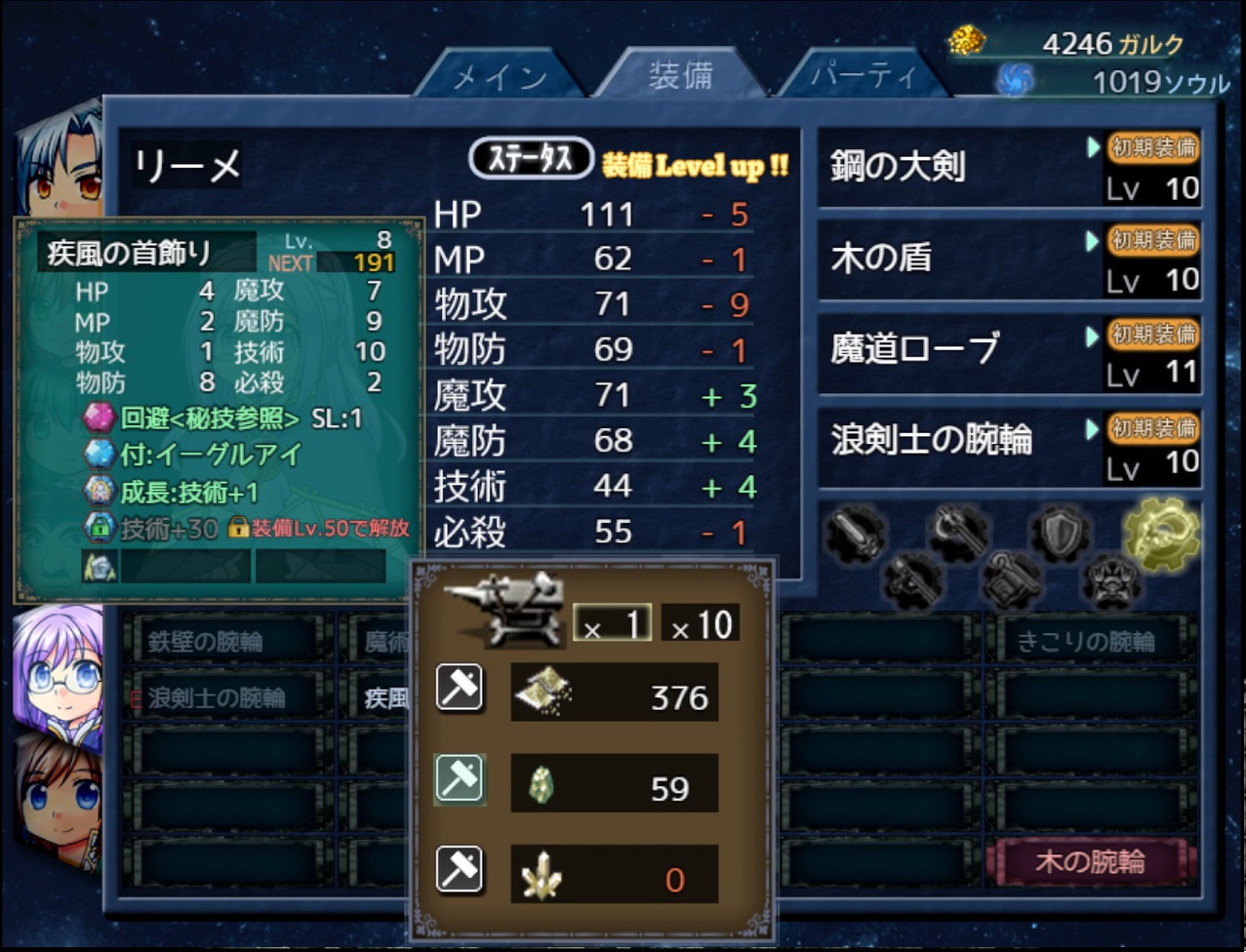 - このシステムのおかげで、たとえ弱い装備品を入手したとしても結果的にパーティ強化に繋がる。