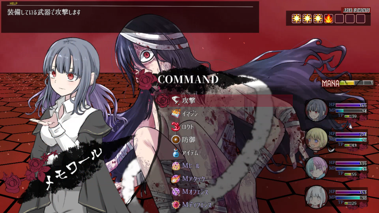 画面右上にあるのは空間属性(AREA ELEMENT)といって、魔法を使うごとに属性アイコンが付与されていき、増えれば増えるほどに特定の属性が強化されていくという仕組みだ。雑魚戦はまだしも戦闘が長期化しがちなボス戦は特に注意が必要で、少し目を離すとボスが使う属性のアイコンばかりになり、いつの間にか全滅するということがまぁ良くある。メモワールの持つスキル『アポカリプティカ』で空間属性を全消去させるか、他属性の魔法を撃ちまくるなどしてスライド消去させるといった戦法が重要となる。