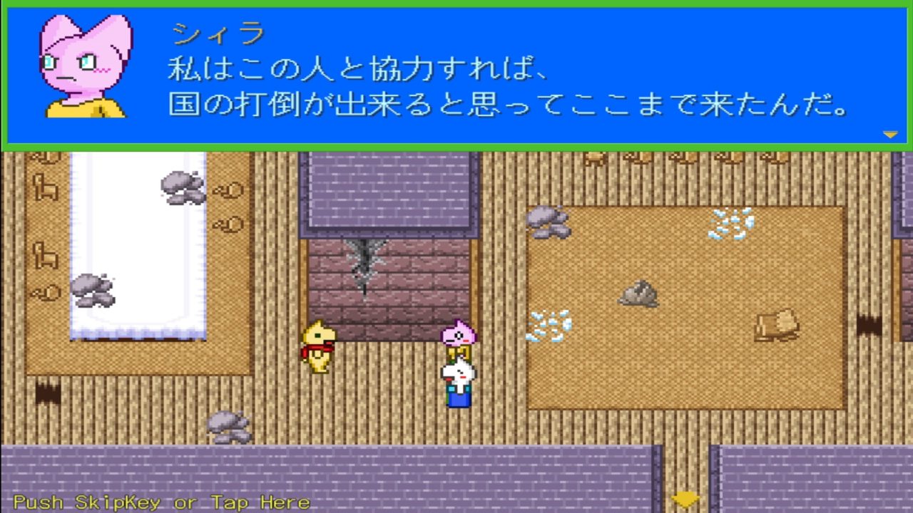 可愛いげのあるイラストやアスキーアートという旧2ch出身要素があるため誤解や偏見を持つ人も居ると思うが、本作のシナリオはギャグ要素はあれど全体を通して結構まじめ。とりあえずゲームを起動して数分オープニングを見てみればどんなものか大体分かるはずだ。親を亡くしたシィラの覚悟が活路を見出し切り開いていく様相と、それに共鳴するように集まる協力者の面々により少しずつ帝国を追い詰めていくストーリー展開はなかなかドラマチックで見応えがある。