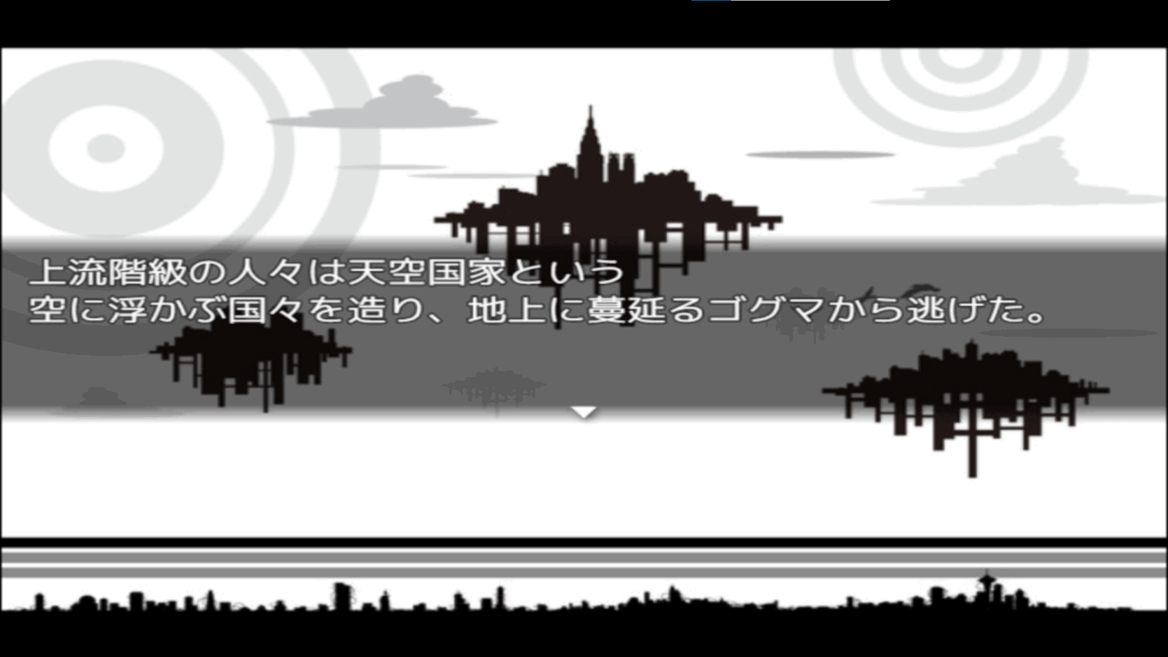 ○天空国家で恵まれた生活を享受する天空人と、ゴグマとの終わらない戦いを強いられる地上人。