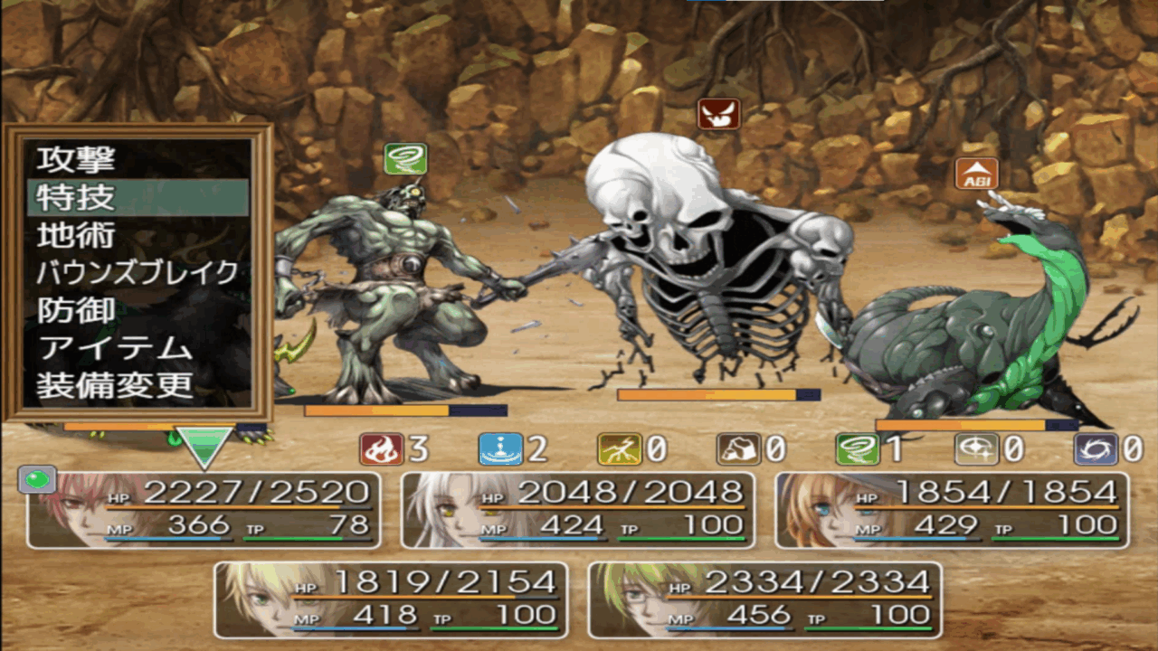 TPが100溜まるとバウンズブレイクを発動することができる。3ターン自身の戦闘能力を向上することができ、更にその状態で特定の特技や術を使うことで超必殺技を発動することが出来る。RPGの要素としては有り触れたものだが、本作ではストーリー中盤以降に更なる超超必殺技を習得することが可能だ。ストーリーの盛り上がりに呼応するように専用カットインイラストが表示されたりもするので、是非その目でご覧いただきたい。