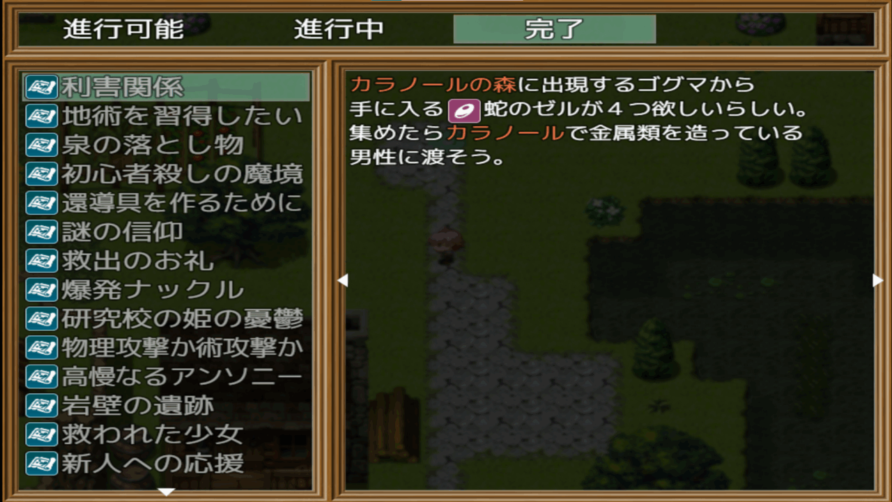 RPGでは定番お馴染みのサブイベント。本編を進めながら息抜きとして沢山のイベントが用意されている。特定の人物に話しかけるだけで完了するものから、お使いのように手間を取らせるものまで様々だ。サブイベントと侮るなかれ、アイテムや装備品がもらえるほか、寄り道ダンジョンに挑戦できたり、中には固有スキルを習得できたりもするので、時間の許す限り片っ端からサブイベントを消化していきたいところ。