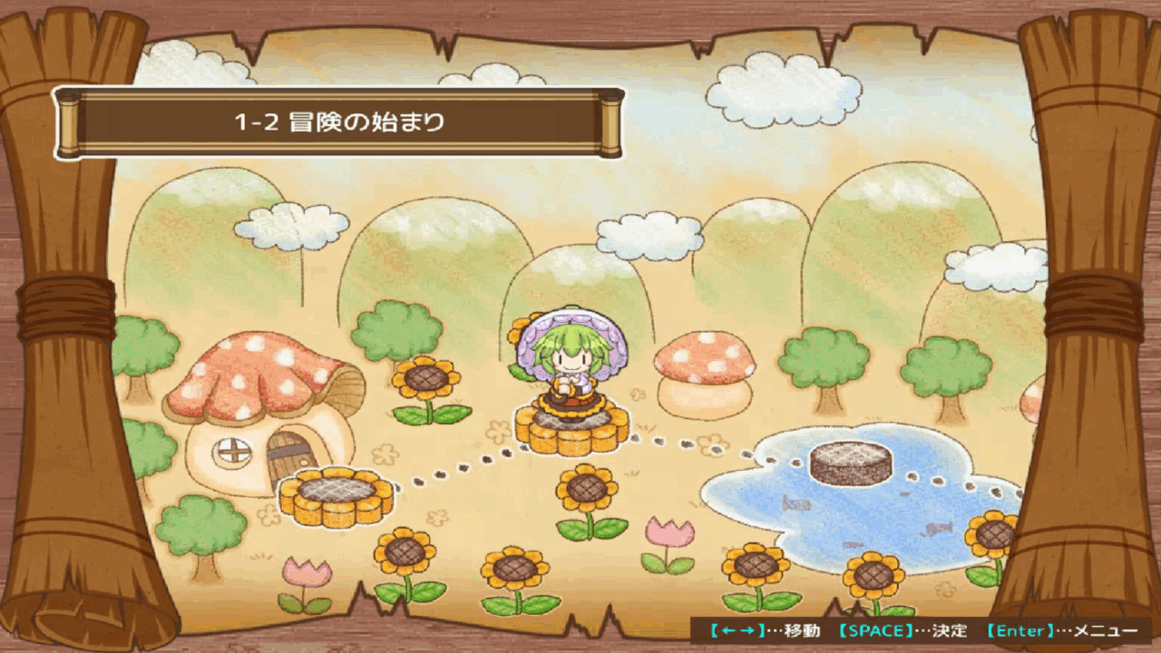 本作ではいちステージあたりかなり長く設定されているのだが、相棒の久侘歌が先回りして休憩地点を作ってくれており、道中の中間地点にあたる土管に入ると体力回復+雑談+中間セーブが出来るようになる。土管の中のゆるふわ感は勿論、後述する難易度のこともあり、この休憩地点を見つけた時の安堵感はひとしおである。
