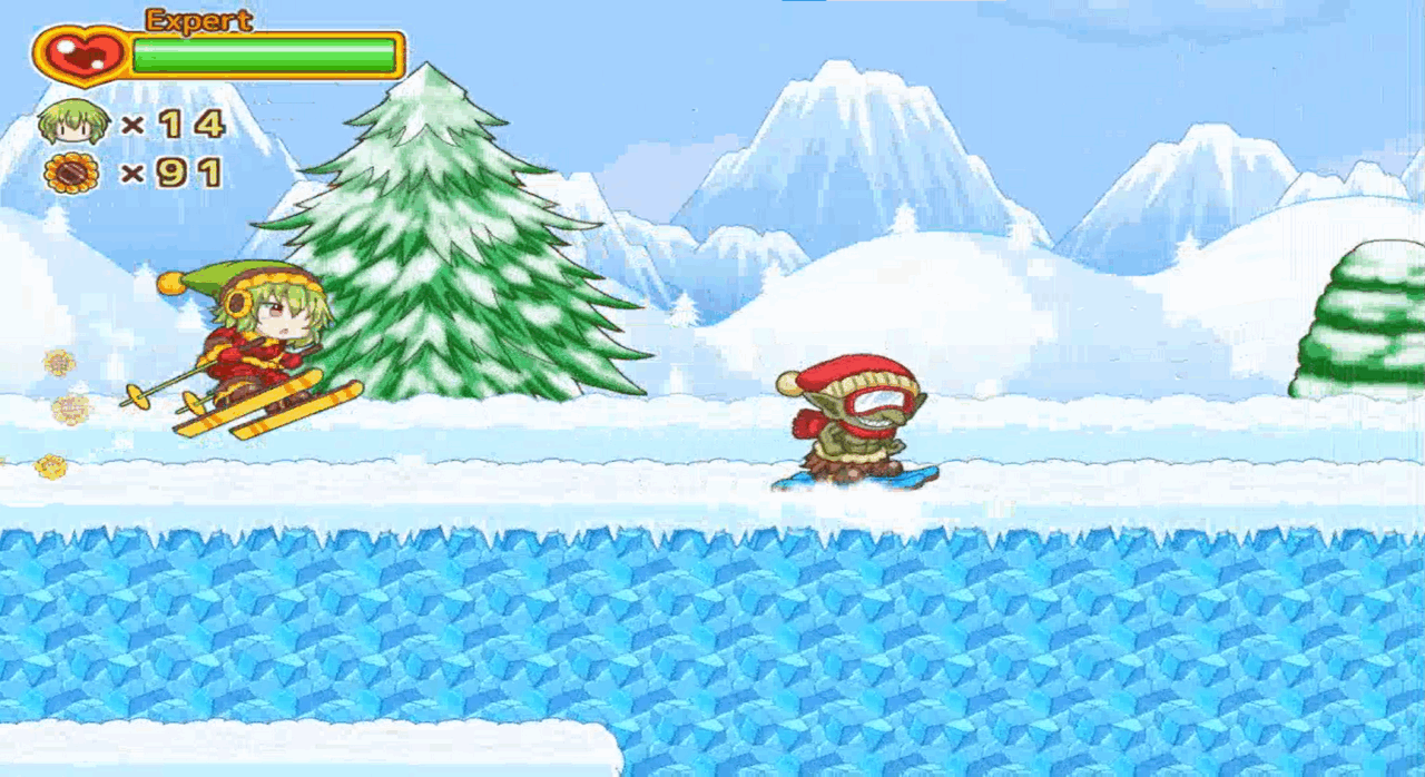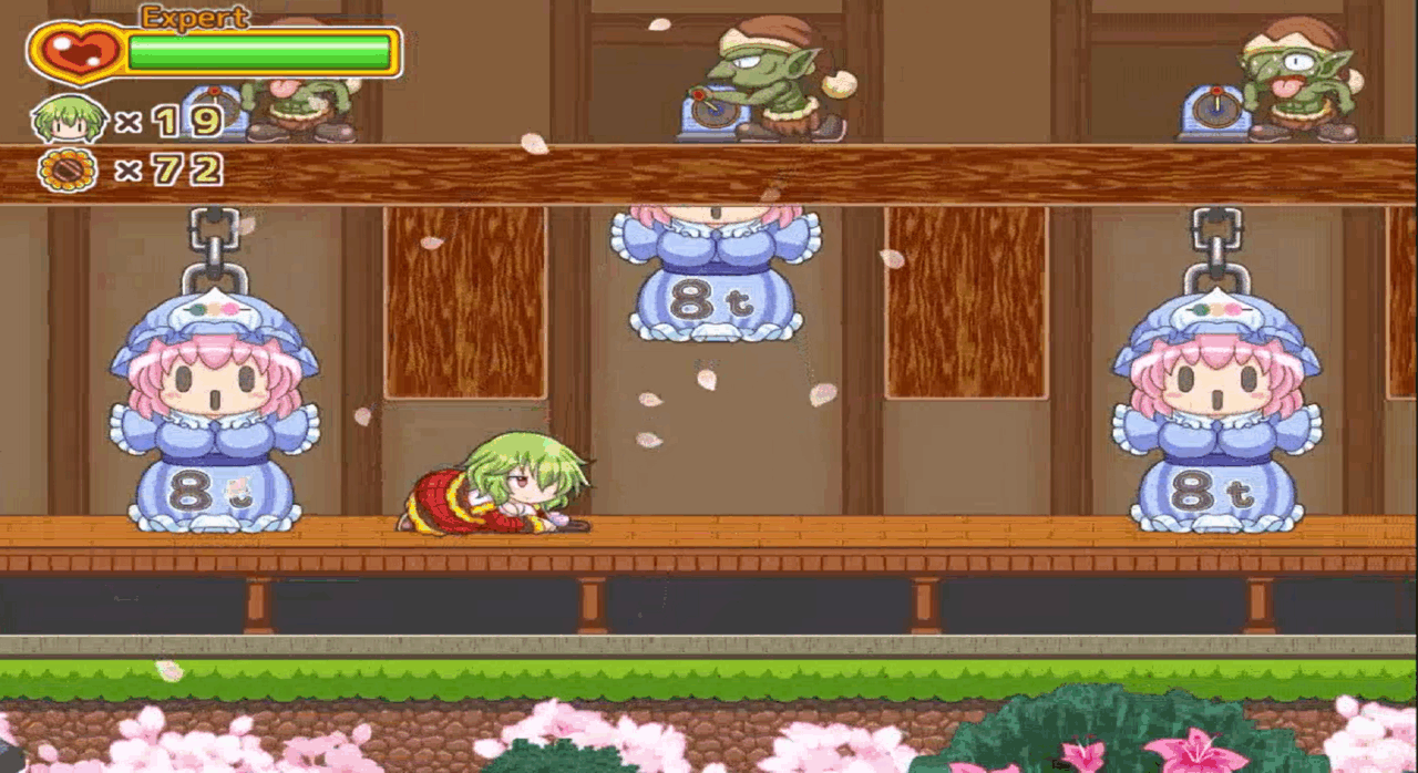 他にも、道中の嫌な場所に出現するハチのデザインも良く似ているし、盾を構えて奈落に弾き飛ばすコインドーザーのような敵も居るし、雪山ワールドのスキーステージは操作感が原作のトロッコステージと良く似ている。一転、クライマックスステージの白玉楼では機械や食べ物をモチーフにした様相もあり、こちらはどことなくゴ〇モンシリーズを彷彿とさせるがどうだろうか?ともかく、他にも色々な個所でオマージュを感じ取れるので、そういった作品を遊んだ経験のある人は是非手に取ってみて欲しいと思う。