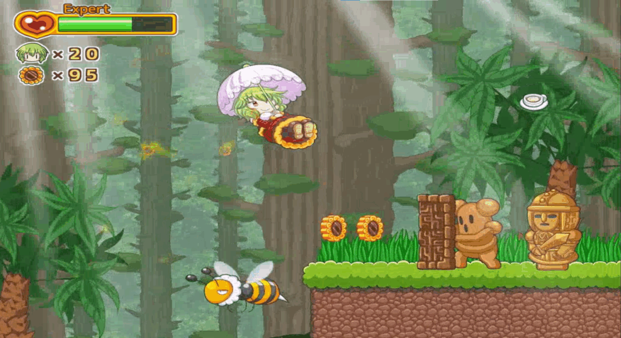 ステージ選択後は操作キャラクターであるゆうかりんを操作し、敵を倒しつつゴールを目指す2D横スクロールアクションだ。道中は敵を倒すほかお菓子でライフを回復できたり、ひまわりコインを100枚回収することで残機を増やすこともできる。そして、彼女はその見た目とは裏腹にかなり多彩な行動を取ることが出来る。下記に具体的なアクションを記載しておこう。